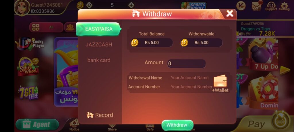 Quick and Secure: Withdraw your winnings directly to your EasyPaisa, JazzCash account, or bank account. The withdrawal process is straightforward: